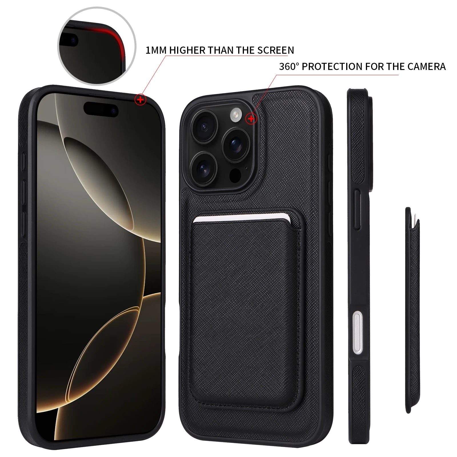 Elevate your iPhone with this 2-in-1 luxury cross-grain leather MagSafe case. Compatible with iPhone 16 Pro Max, 16E, 16 Plus, 15, 14, and 13 models. Includes a magnetic card holder for secure, convenient storage of essentials. Strong MagSafe alignment ensures fast wireless charging and firm attachment. Premium leather finish offers durability, elegance, and everyday protection.