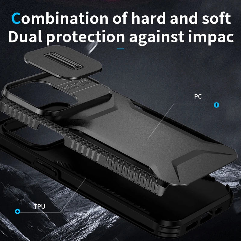 Protect your iPhone with confidence using this rugged, military-grade shockproof case, designed with a sliding camera cover for ultimate lens protection.