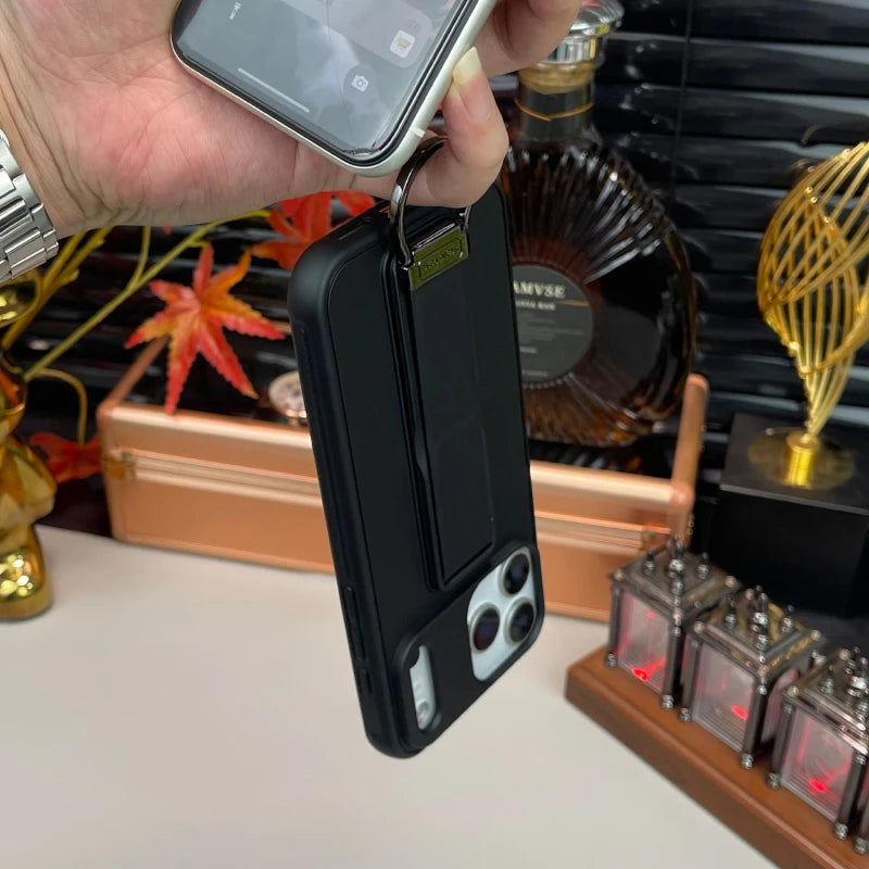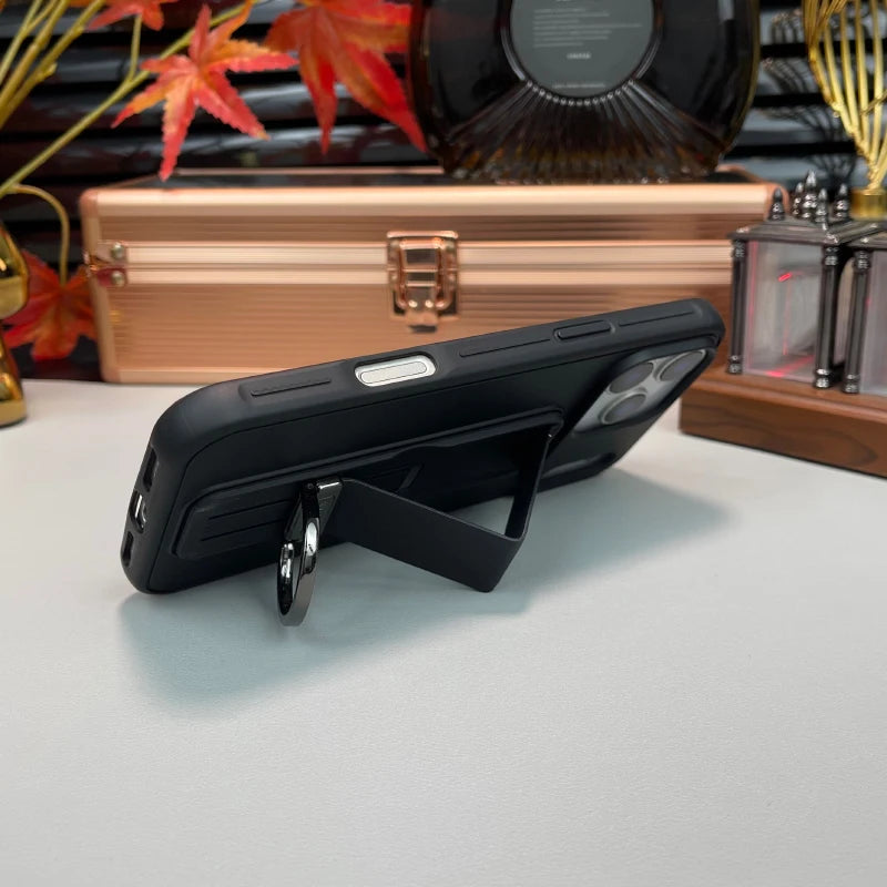 Luxury solid-color phone case with a matte metal push-pull ring bracket, durable bumper edges, and a sleek back cover design, delivering premium style, secure grip, and reliable protection for iPhone Pro Max and Air models.