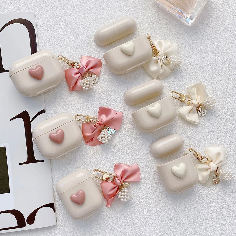 Ribbon Bowknot Pearl Keychain Case for AirPods 4 3 2 Pro Shockproof Cover