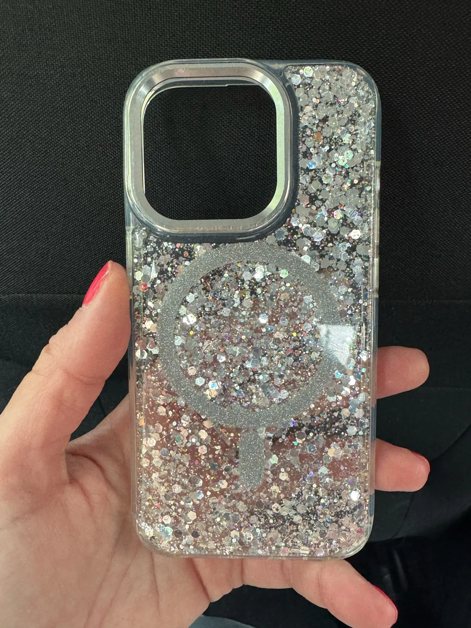 Add sparkle and protection to your iPhone with this glittery MagSafe-compatible case designed for impact resistance and wireless charging convenience.